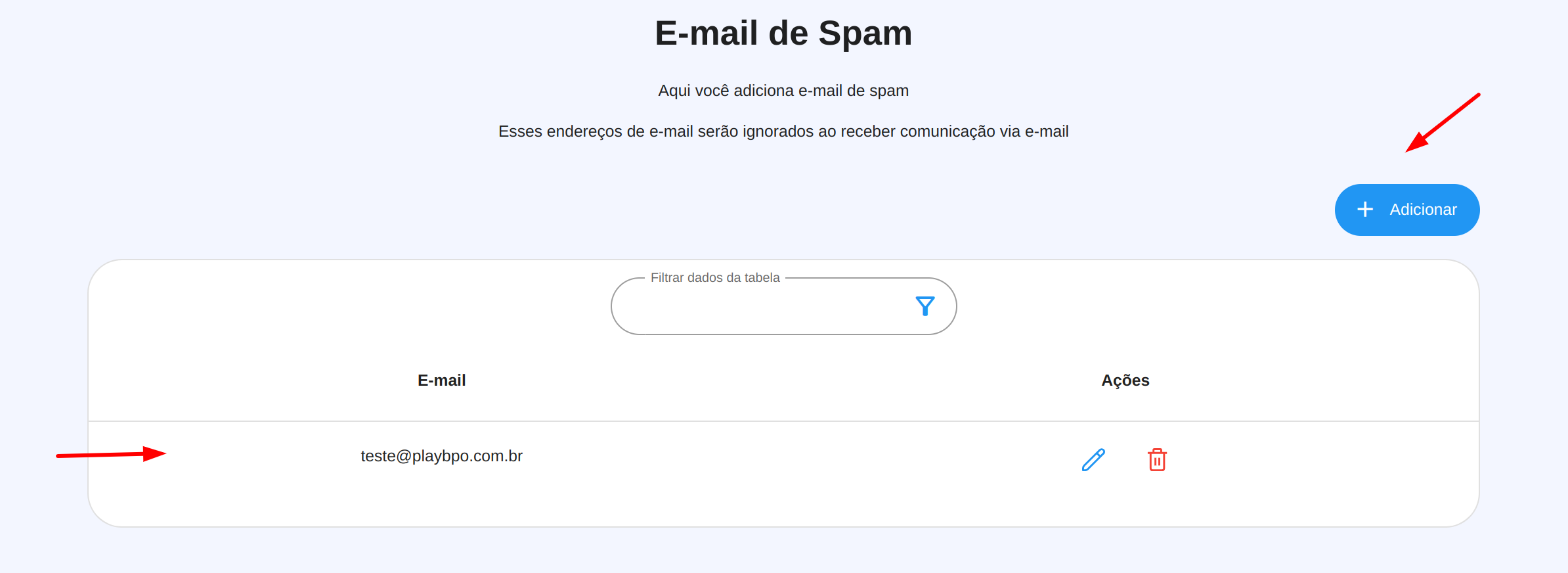 A funcionalidade de cadastro de e-mails como spam permite que você bloqueie o recebimento de mensagens indesejadas diretamente na caixa de entrada das comunicações por e-mail.