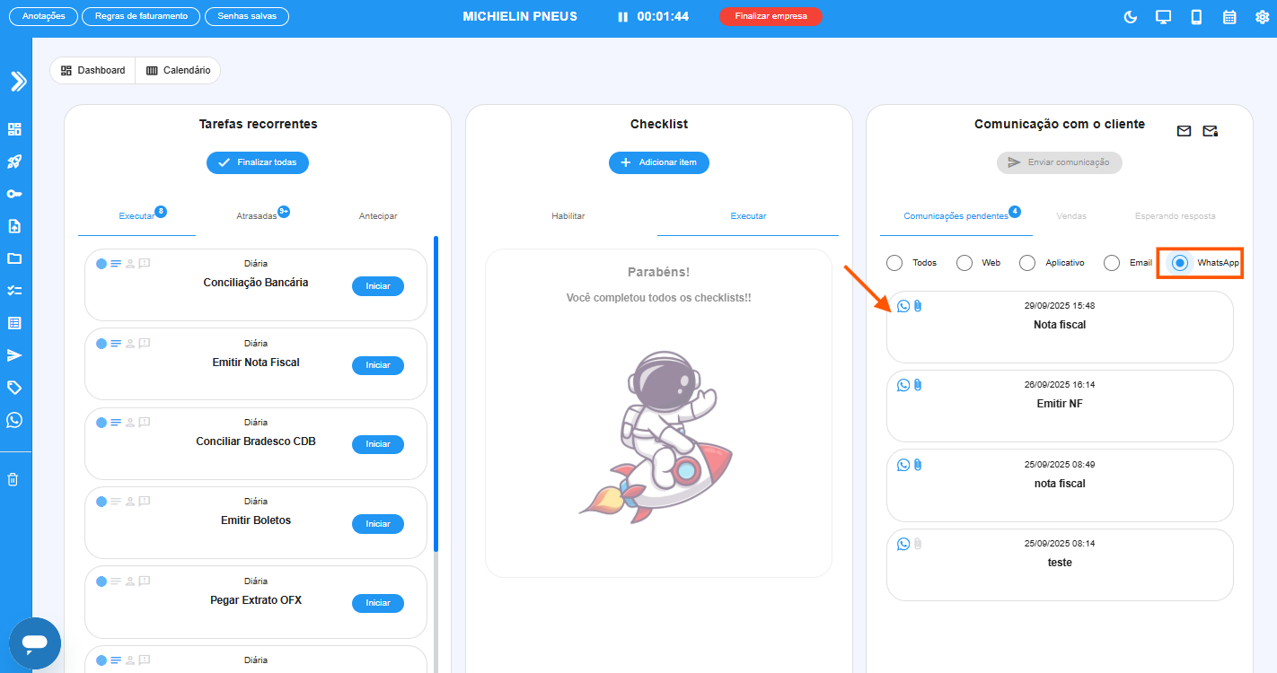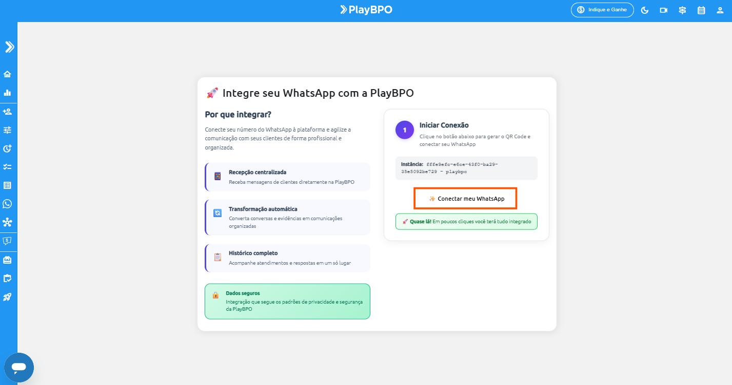 - Em seguida, ainda no menu lateral, clique em WhatsApp e escaneie o QR Code com o celular (mesmo processo do WhatsApp Web).