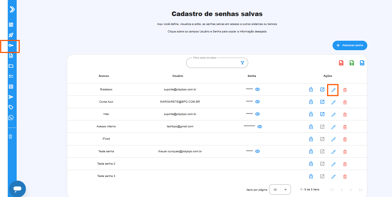 Ao localizar a senha que deseja alterar, clique no ícone de lápis, que representa a ação de editar.